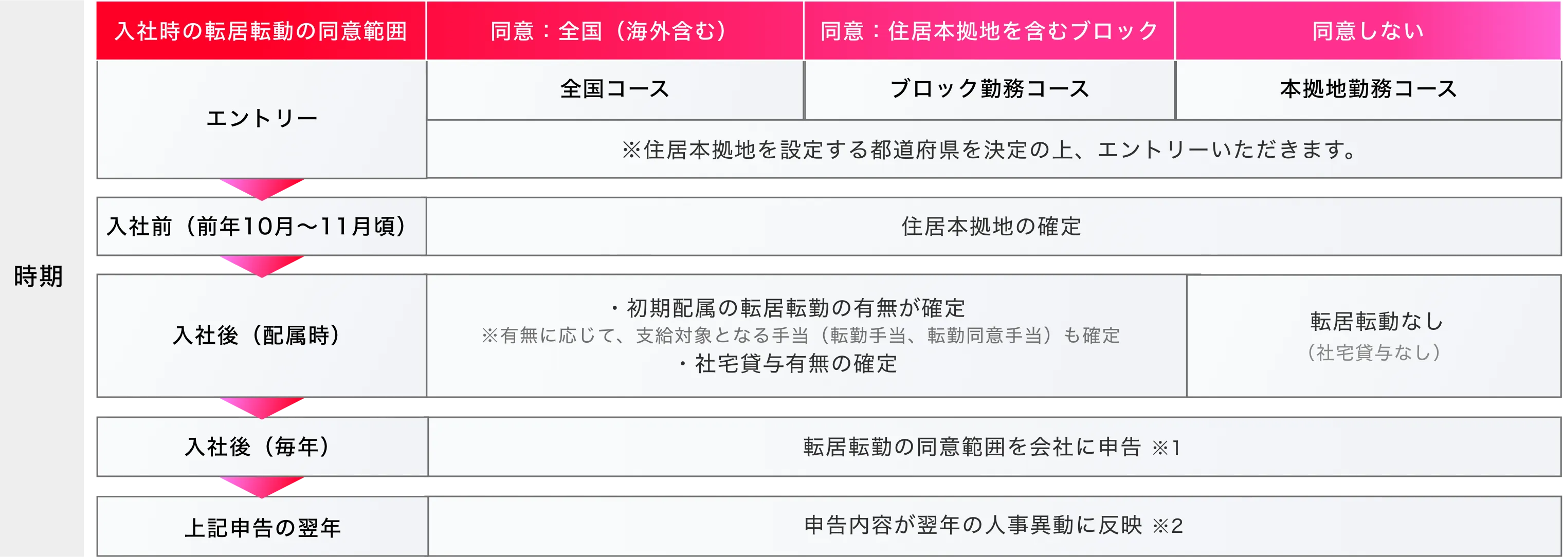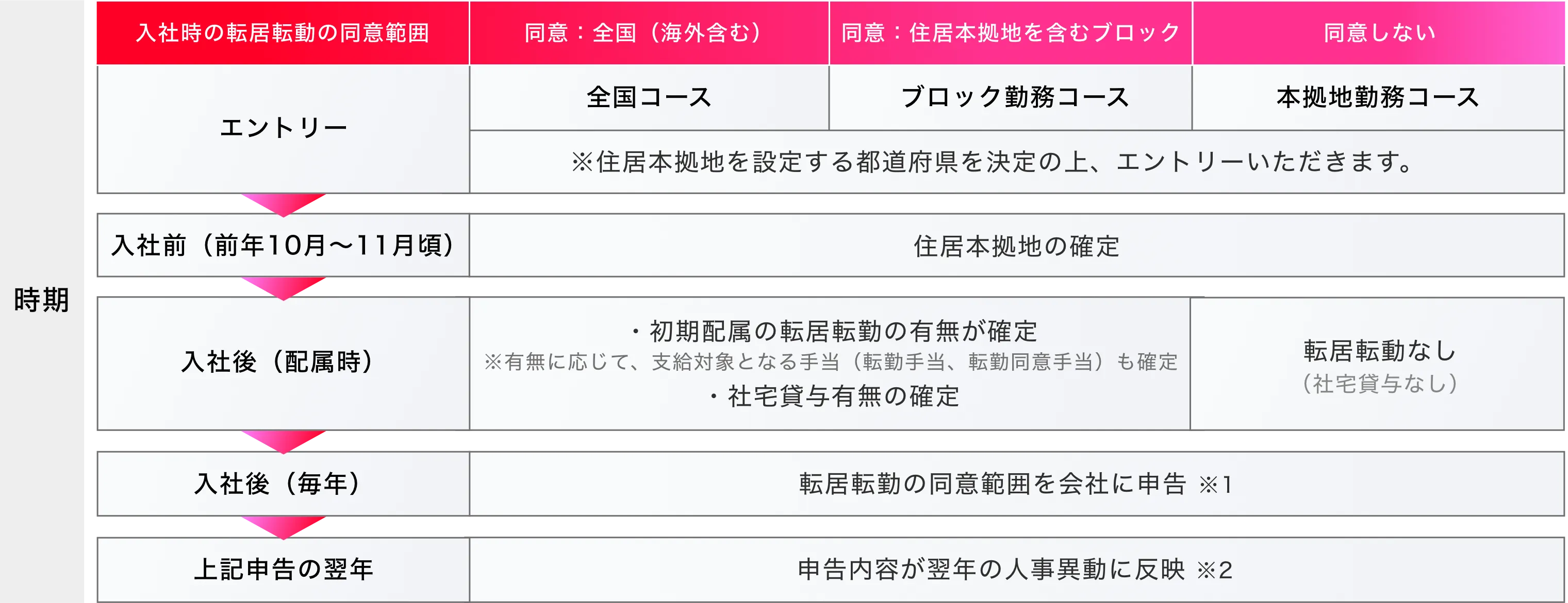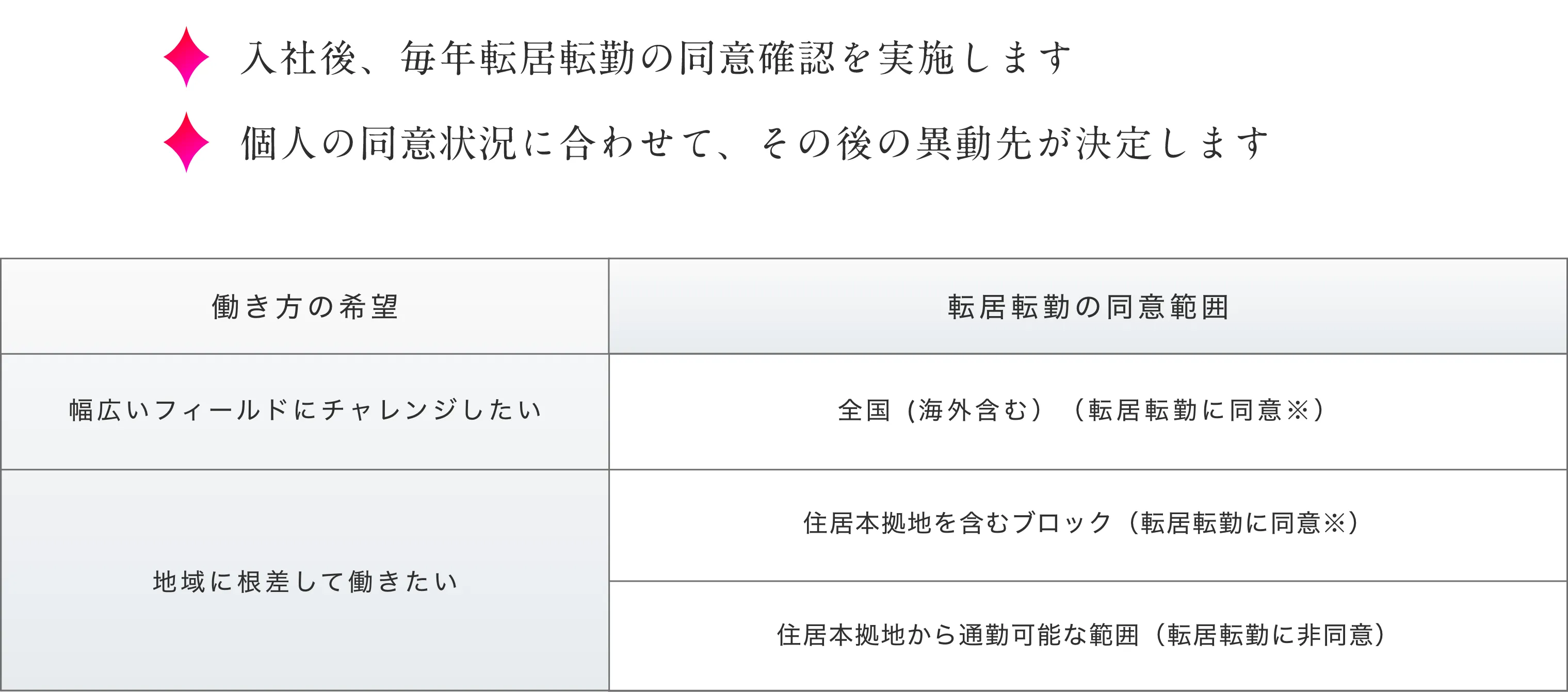 ※2 転居転勤に同意した場合にも、住居本拠地から通勤可能な範囲の勤務地となる可能性もあります。
